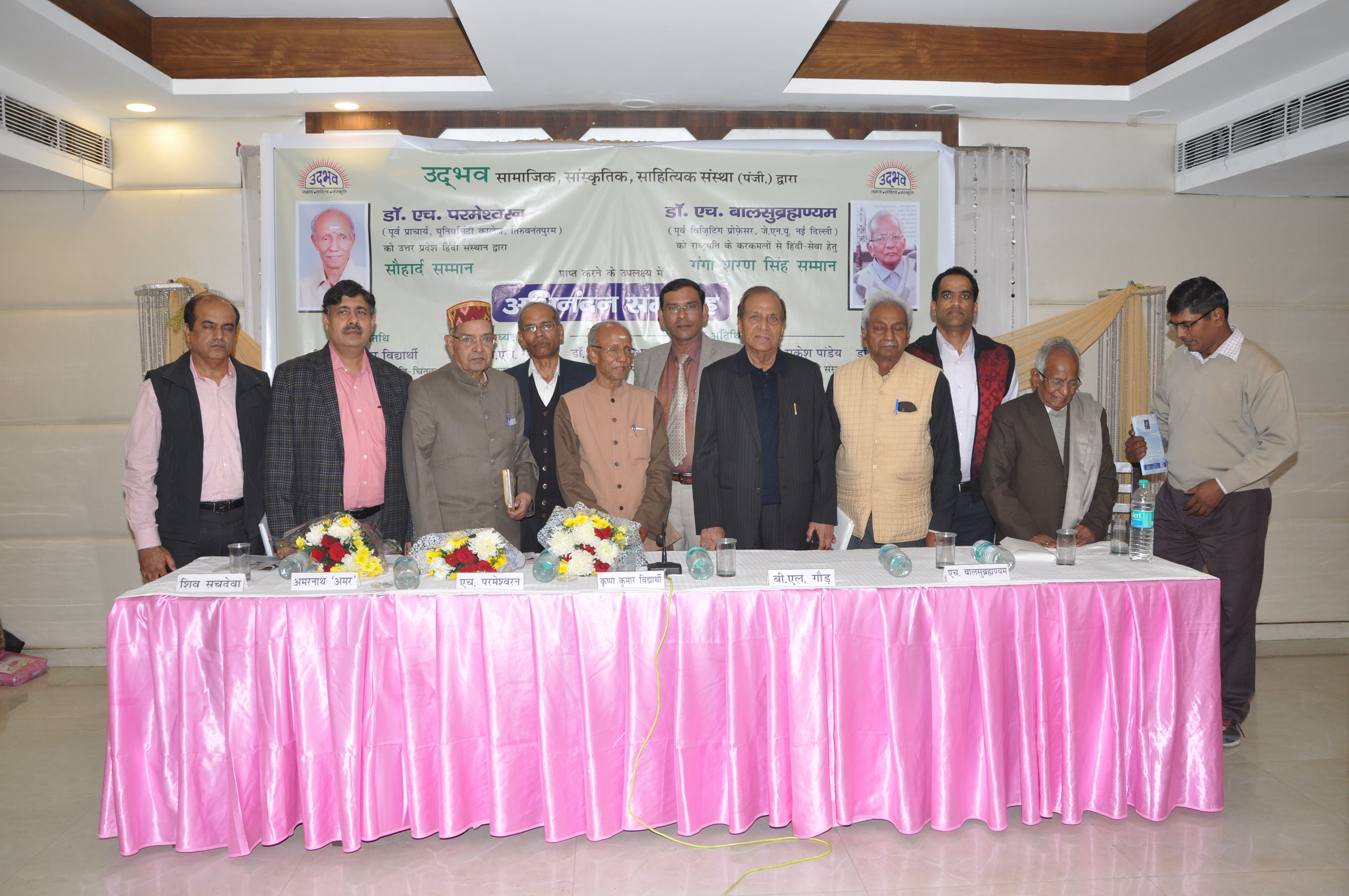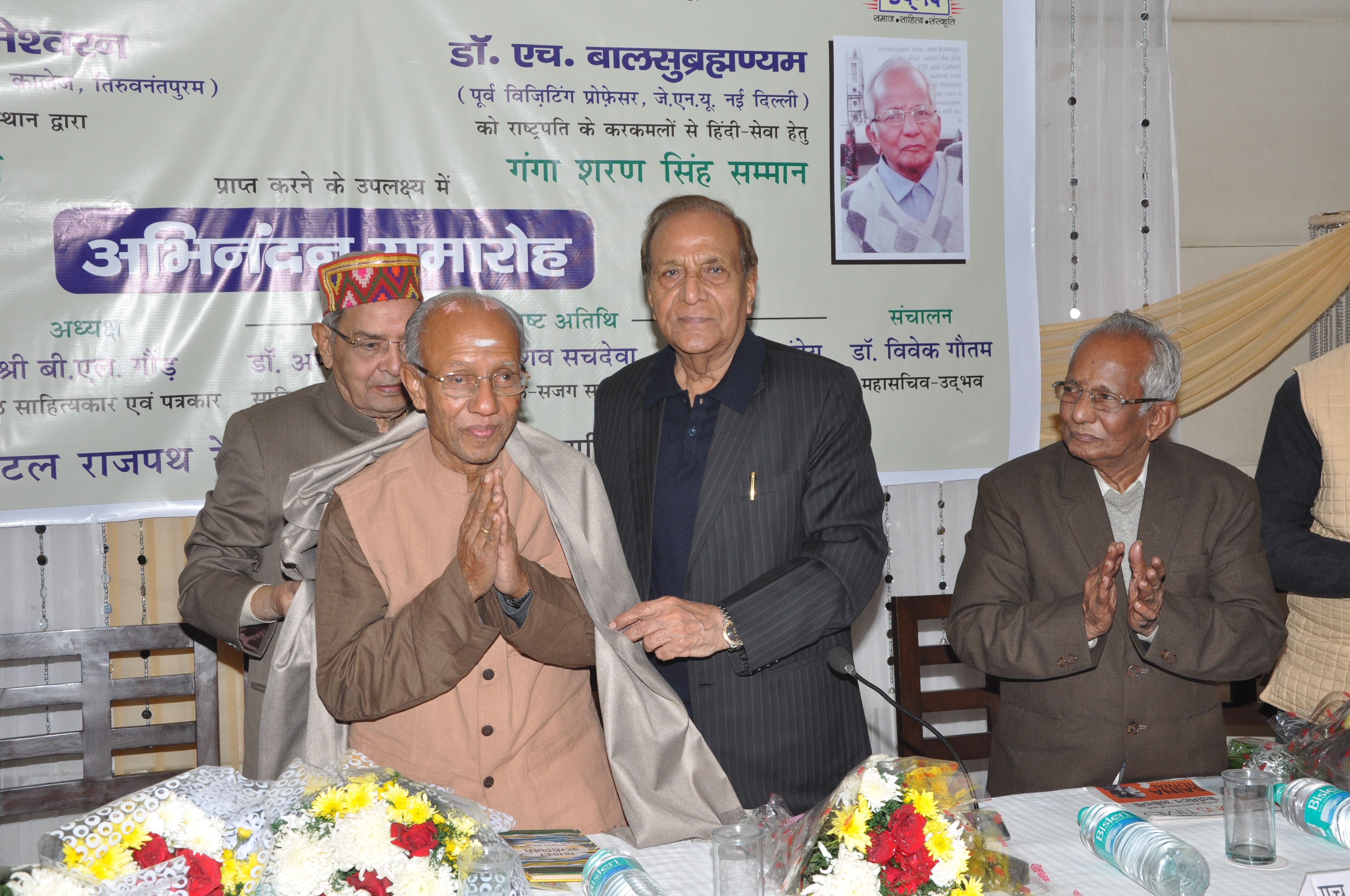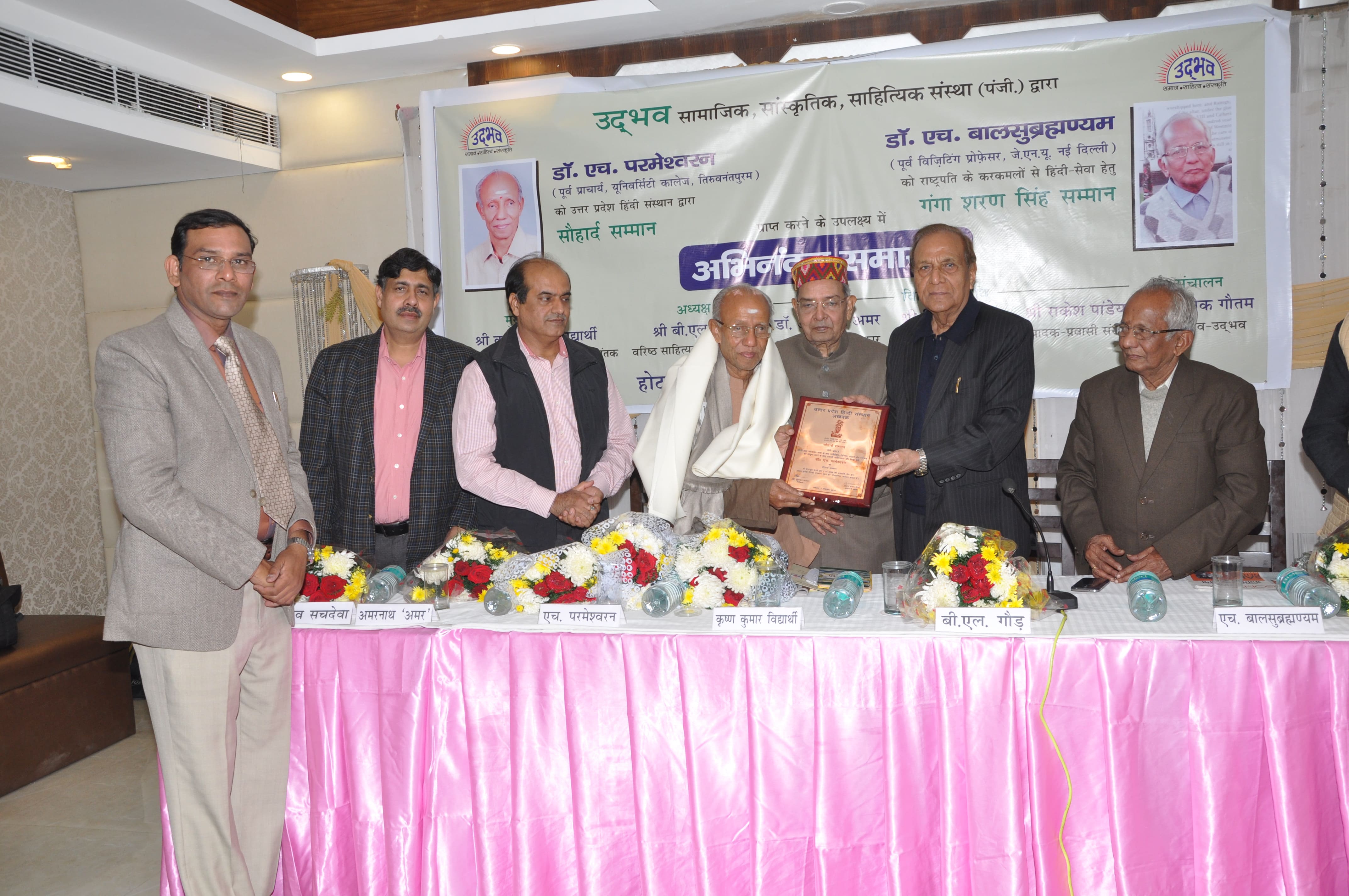 उदभव सामाजिक, सांस्कृतिक, साहित्यिक संस्था (पंजी.) द्वारा, डॉ. अच्पर मे श्वरन (पूर्व प्राचार्य, यूनिवर्सिटी कॉलेज, तिरुवनंत पुरम) को उत्तर प्रदेश संसथान द्वारा सौहार्द सम्मान, एवंडॉ. अच्बाल सुब्रमणियम (पूर्व विजिटिंग प्रोफेसर, जेऍनयू , नई दिल्ली ) को राष्ट्रपति के करकमलो से हिंदी सेवा हेतु गंगाशरण सिंह सम्मान , प्राप्त करने के उपलक्ष्य में अभिनन्दन समारोह।
